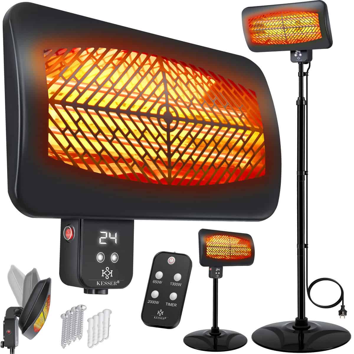 KESSER Infrarot-Standheizer 2000W mit 3 Leistungsstufen (650W/1350W/2000W). Höhenverstellbar 80-210cm in 4 Positionen. Fernbedienung mit Timer 1-24 Stunden. 45° schwenkbar. Instant-Heat 2 Sekunden Startzeit. Installation möglich, Befestigungsmaterial inklusive. Display präsentiert Einstellungen. Kippschutz bei 45° Schräglage. Edelstahlsockel, Edelstahl-Schutzgitter. Geräuschlos. Spritzwassergeschützter Hauptschalter. Für Terrasse, Balkon, Gastronomie, Wickeltisch, Werkstatt. 160cm Kabellänge.
